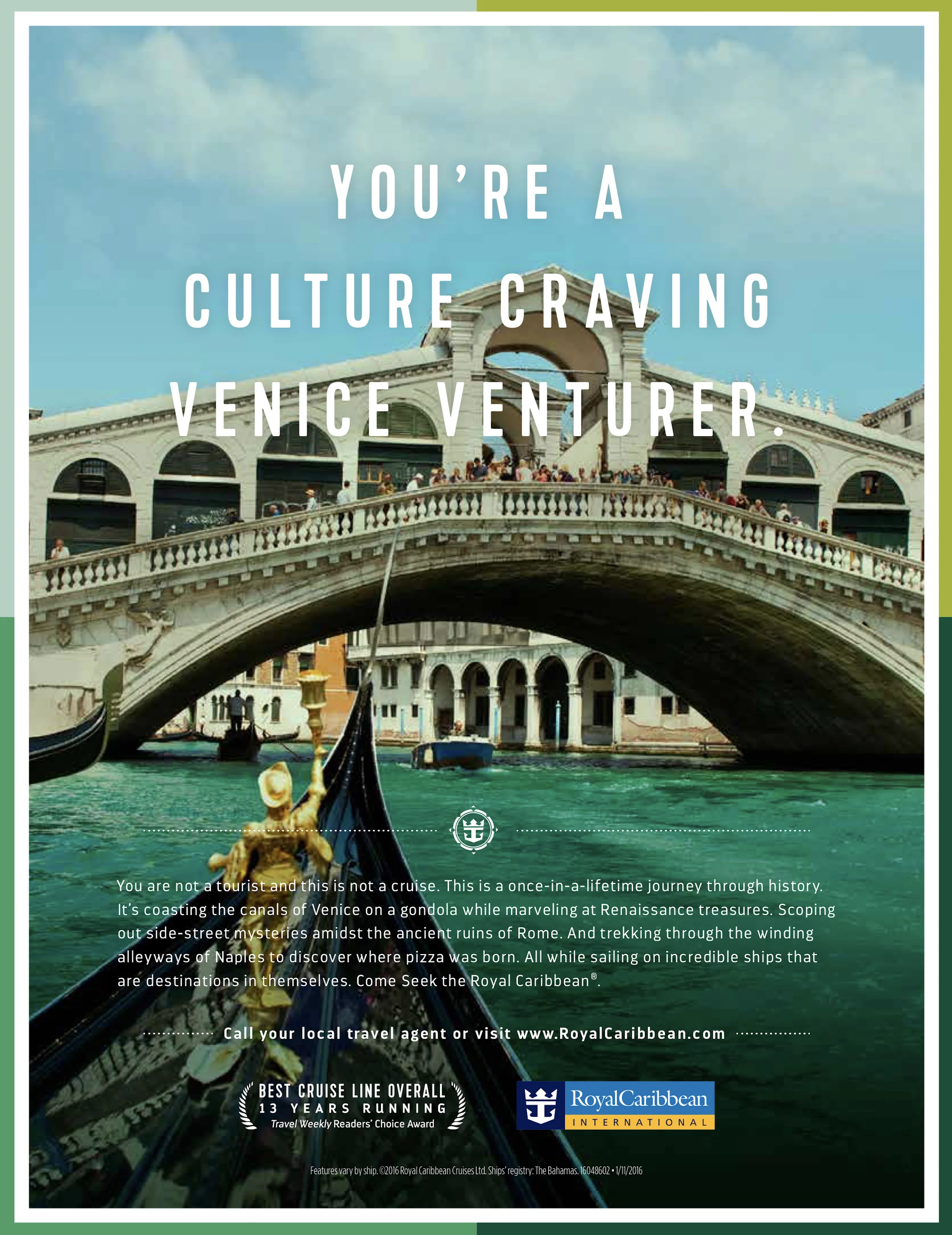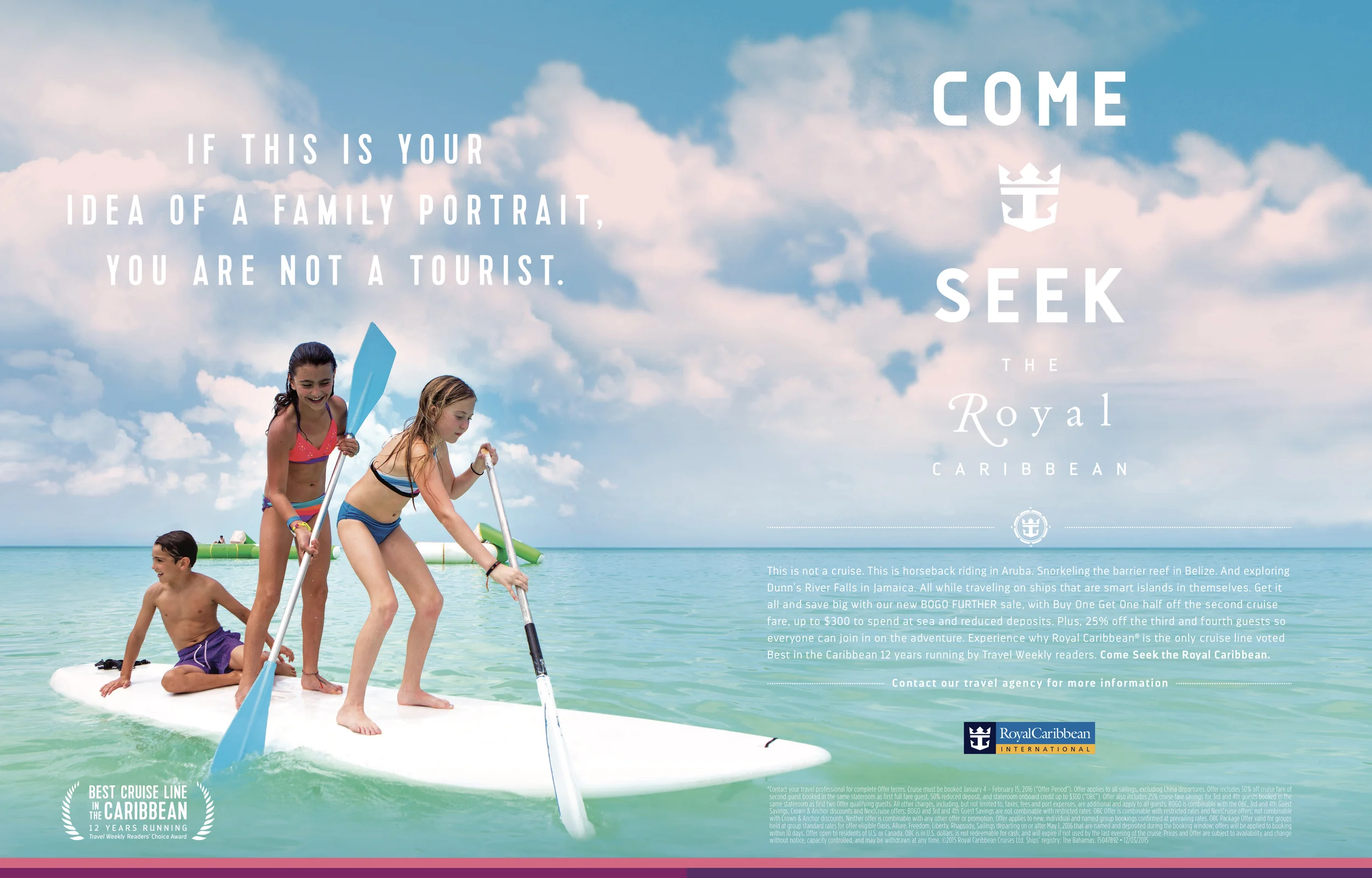 This is not the Caribbean. This is the Royal Caribbean. That's the message at the heart of the Come Seek campaign, a new brand direction for Royal Caribbean aimed at tackling common misperceptions about cruising head-on. Ads feature bold images that put the reader or viewer in the middle of the action, revealing the unique destinations and immersive cultural experiences they'll encounter on their Royal Caribbean adventure.